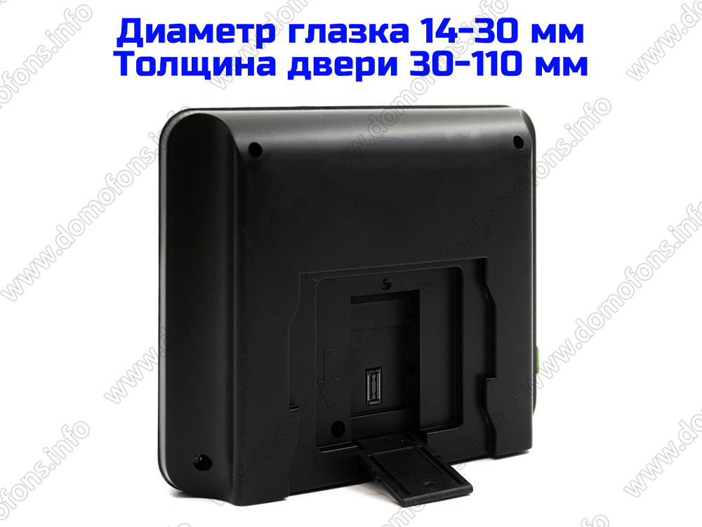 Простота установки. Видеоглазок устанавливается на дверь толщиной 30-118 мм вместо обычного дверного глазка (диаметр отверстия 14-35 мм), весь крепеж поставляется в комплекте.