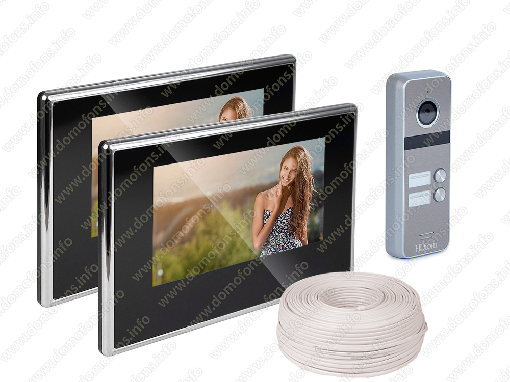 Комплект на 2 квартиры «Вызывная панель HDcom 84207-2-AHD + 2 монитора HDcom B-714AHD» - набор, состоящий из двух AHD видеомониторов высокого разрешения с диагональю экрана 7 дюймов, 2-абонентской вызывной панели со встроенной камерой разрешением 1,3 мегапикселя и комплекта проводов. Такой комплект используется для установки в двух квартирах, двух офисах, или других помещениях с общей входной дверью.