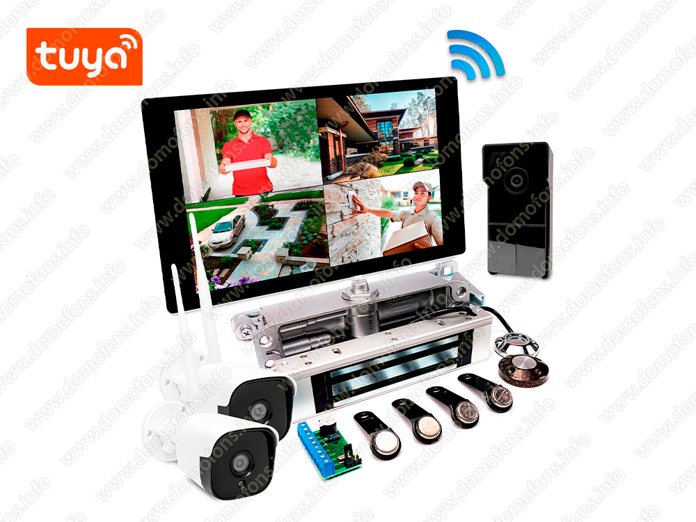 Комплект беспроводной TUYA Wi-Fi видеодомофон с 2 камерами и электромагнитным замком - "SkyNet 1000 (1+2+180G)" не требует прокладки кабеля для связи монитора с вызывной панелью, замком и камерой благодаря работе по Wi-Fi 2,4 ГГц. Дальность связи составляет до 100 м (без препятствий). Комплект поддерживает дистанционный просмотр, прием видеовызывов и открытие замка со смартфонов.