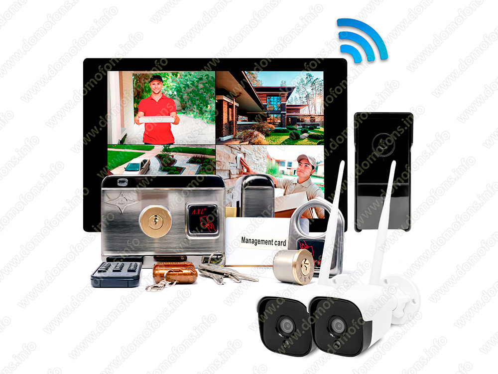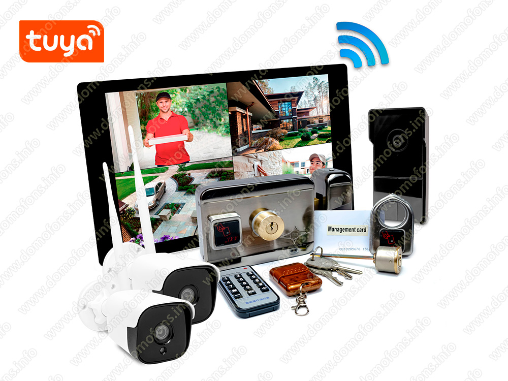 Комплект беспроводной видеодомофон TUYA Wi-Fi с 2 камерами наблюдения и с электромеханическим замком "SkyNet 1000 (1+2+AX066)" HD экран 10 дюймов, 3MP вызывная видеопанель, электромеханический замок Anxing Lock - AX066, 2 беспроводные уличные камеры наблюдения 3mp