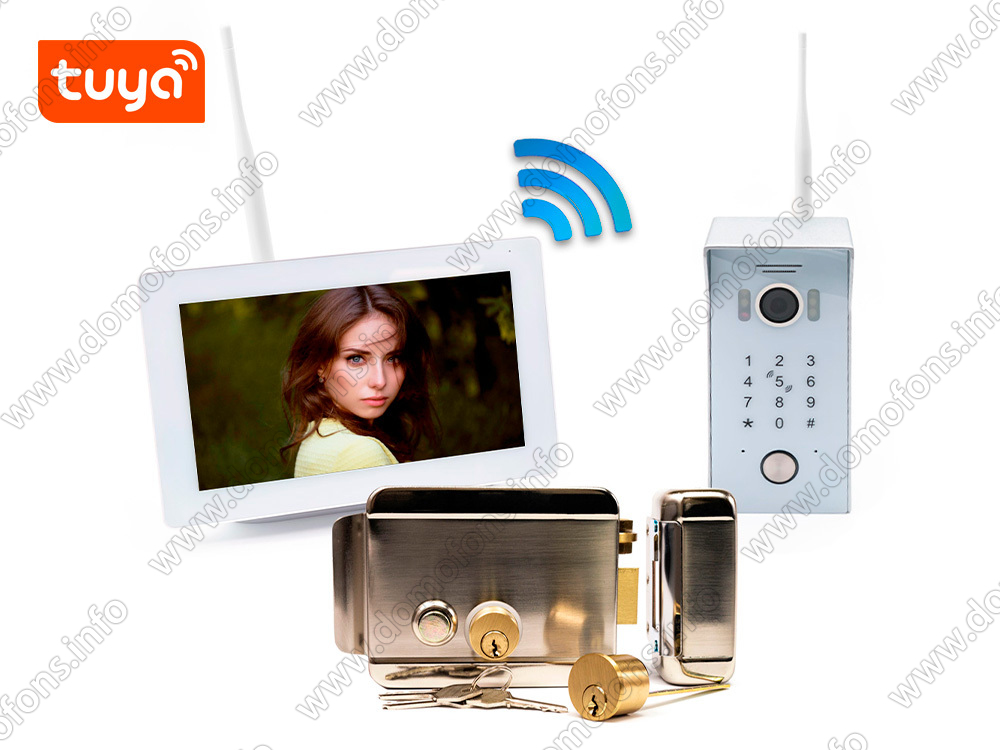Беспроводной комплект Wi-Fi домофона и замок AX042 «SkyNet 700-Tuya (1+0+AX042)» Беспроводной видеодомофон, беспроводная вызывная панель EPC-81225 и электромеханический замок AX042. Дальность до 300м.