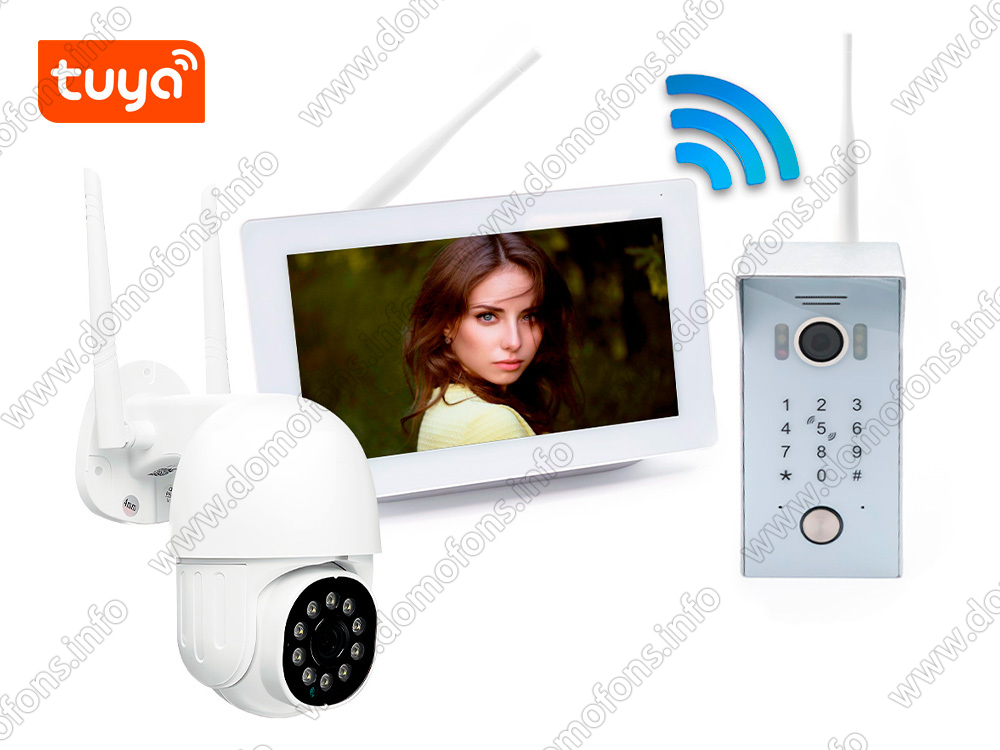 Дальность связи монитора и вызывной панели составляет до 300 метров (без препятствий) — одно из преимуществ комплекта SkyNet 700-Tuya (1+1). Дальность связи с поворотной камерой зависит от мощности Wi-Fi роутера пользователя. Вызывная панель оборудована кодовой панелью и считывателем электронных ключей для открывания замка (приобретается отдельно).