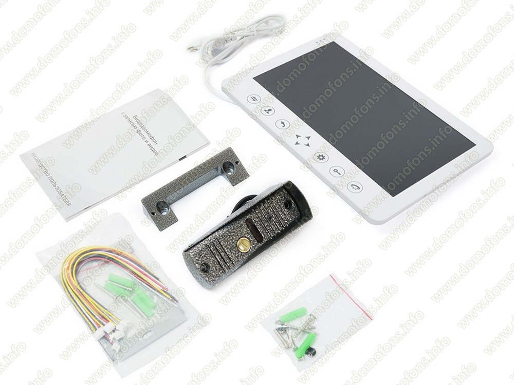Крепеж в комплекте. Кронштейн монитора и панели, разъемы для подключения, а также угловой кронштейн с козырьком поставляются в комплекте с домофоном.