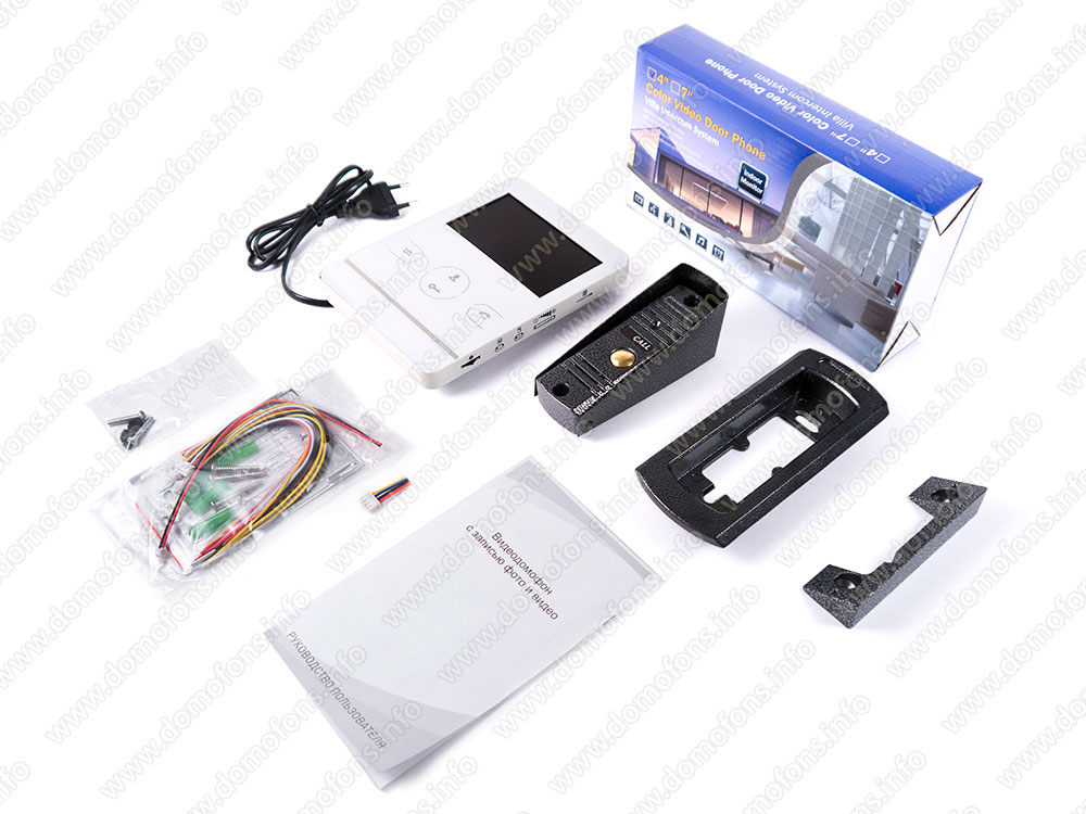 Видеозаписи и фотографии происходящего можно записать на карту памяти формата microSD объемом до 32 ГБ (в комплекте не поставляется). Встроенная память прибора может вместить до 80 фотографий. К комплекту домофона можно подключить электромехпнический или электромагнитный замок и открывать дверь посетителю дистанционно с видеомонитора.