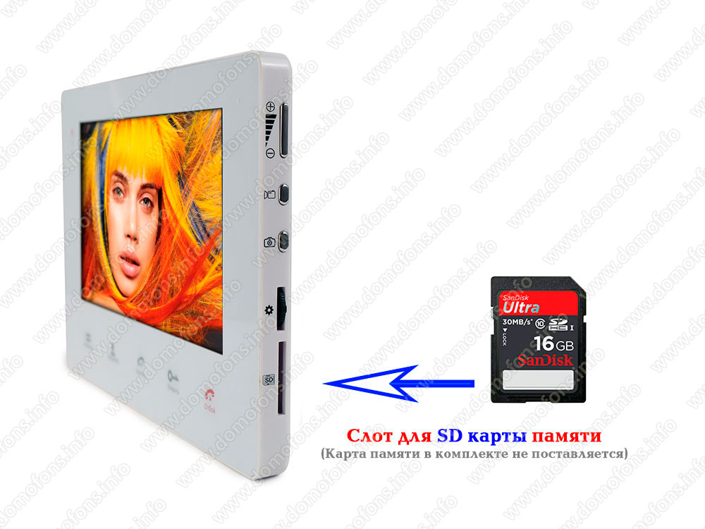 Поддержка карты памяти. Для записи видео в монитор необходимо установить карту памяти формата SD объемом не более 32 Гб (приобретается отдельно).