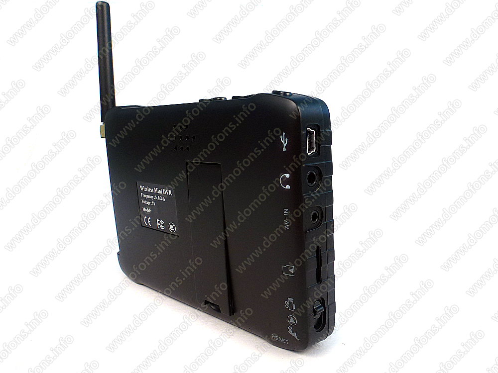 Запись осуществляется на карту памяти до 32Гб, что позволяет записать видеоархив до 42 часов. Комплект состоит из беспроводного видеоглазка и приемника-регистратора с 5 дюймовым цветным монитором. Видеосигнал передается по радиоканалу на частоте 5,8 ГГц.