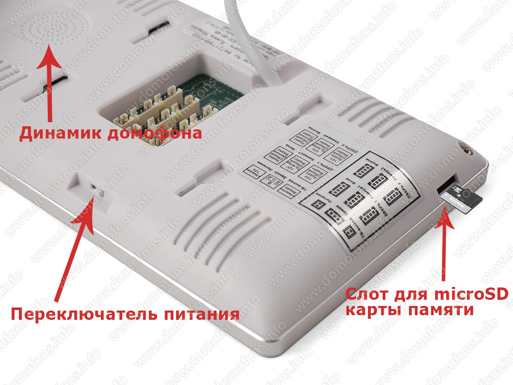 Автоматическая запись по движению и при вызове. Вы можете настроить автоматическую запись по движению, которая включится как только в поле зрения любой из камер начнет передвигаться какой-либо объект. При нажатии на кнопку вызова, домофон также начнет запись на карту памяти формата MicroSD (в комплекте не поставляется).
