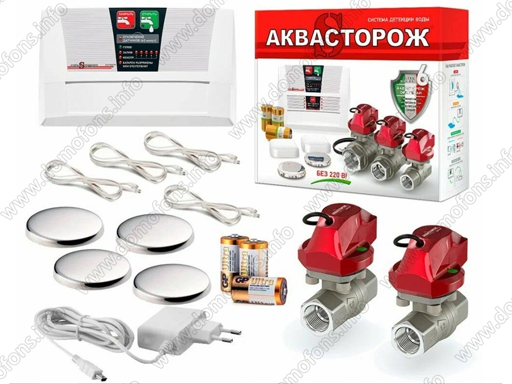 В комплект входят 2 привода с кранами размером 3/4" (ДУ 20 мм). Система Аквасторож Комплект 22.74 3/4 позволяет подключение до 4 приводов к управляющему блоку.